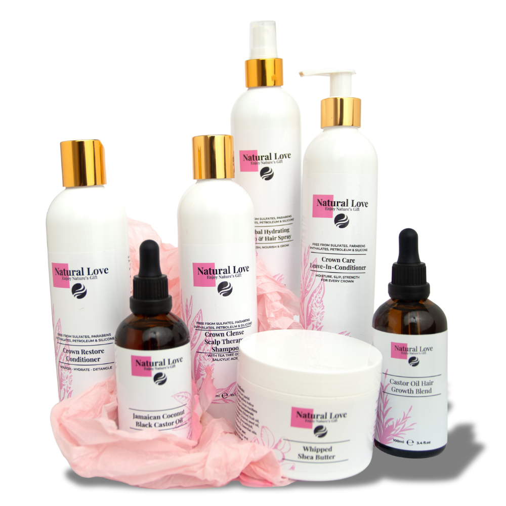 The Crown Care Essentials Combo is the ultimate Natural Love hair care ritual, thoughtfully curated to nourish, protect, and celebrate your crown from wash day to styling. This bundle includes the Crown Cleanse Scalp Therapy Shampoo, Crown Restore Conditioner, Crown Quench Deep Moisture Hair Mask, Crown Care Leave-In Conditioner, and the Herbal Hydrating Scalp & Hair Spray.
